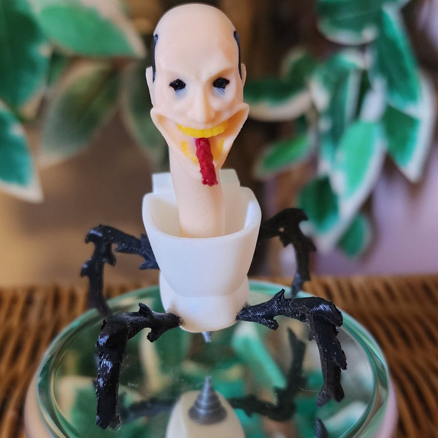 Parasitic Skibiti Toilet with Black eyes, yellow teeth, and a parasitic tongue. All models will come pre assembled as pictured. If you would like this or any other model unassembled please message me and I can make that happen. (Please supervise small children when playing with toys that present a choking hazard).
